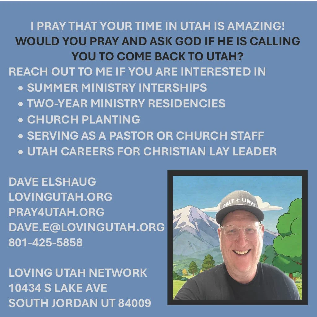 Utah needs young Christian leaders like you to serve in local churches, whether as lay leaders or as pastors. We have a great need for youth, children’s, worship, counseling and other leadership positions to bring a gospel presence into every neighborhood in Utah.