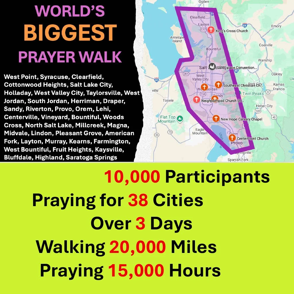 Praying in 38 Cities: West Point, Syracuse, Clearfield, Cottonwood Heights, Salt Lake City, Holladay, West Valley City, Taylorsville, West Jordan, South Jordan, Herriman, Draper, Sandy, Riverton, Provo, Orem, Lehi, Centerville, Vineyard, Bountiful, Woods Cross, North Salt Lake, Millcreek, Magna, Midvale, Lindon, Pleasant Grove, American Fork, Layton, Murray, Kearns, Farmington, West Bountiful, Fruit Heights, Kaysville, Bluffdale, Highland, Saratoga Springs.